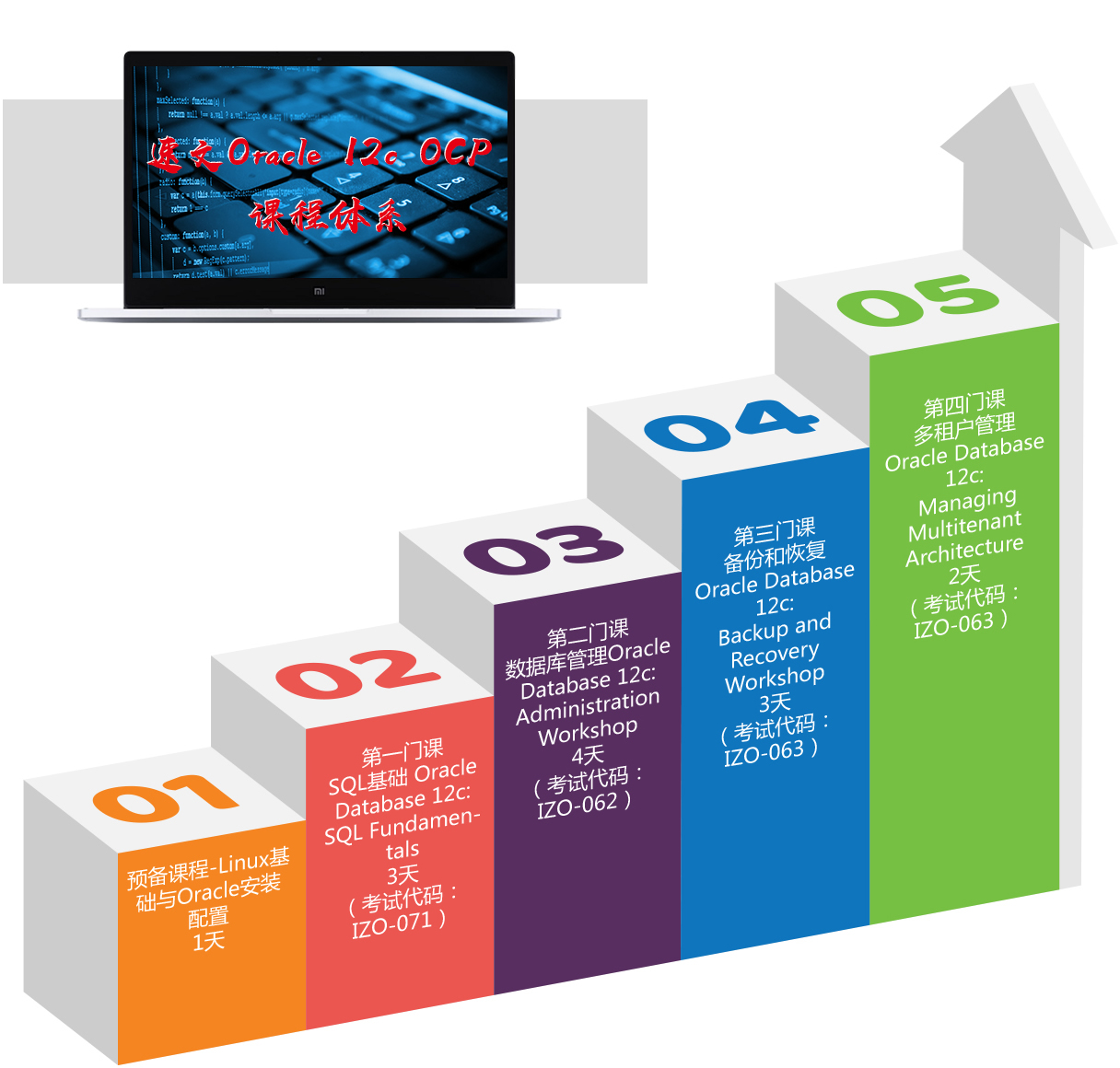 OCA课程为下列课程体系中的预备课程、第一门课和第二门课,即前面8天的课程,具体课程大纲详见OCP课程介绍。